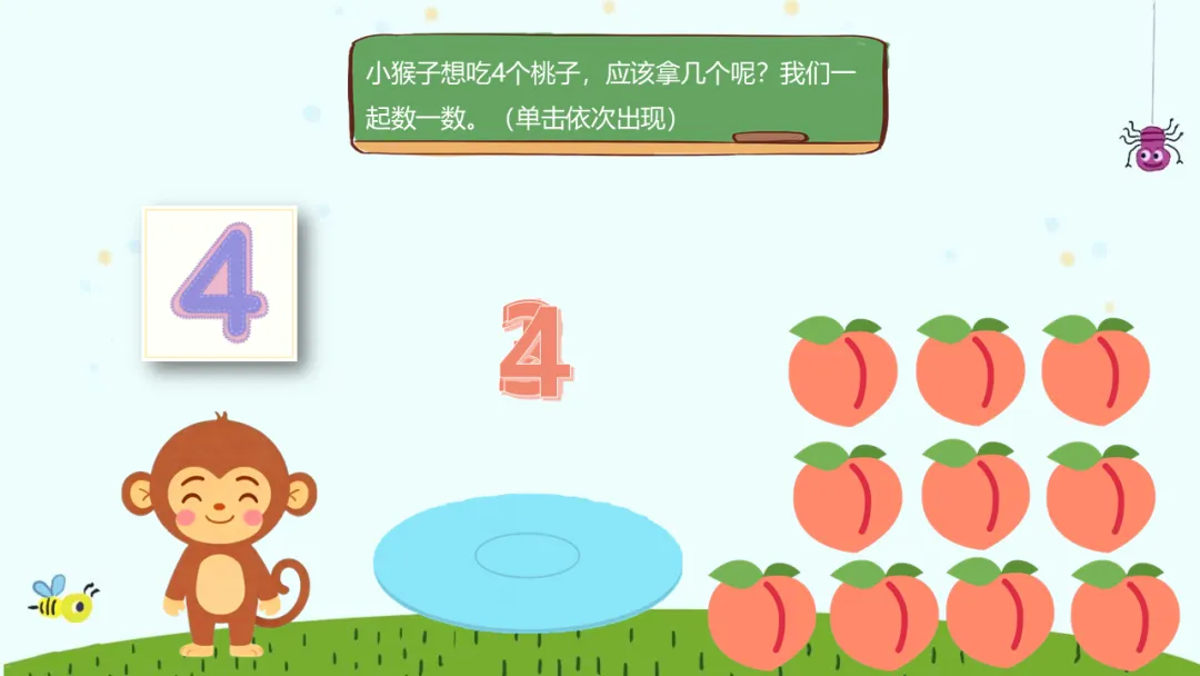 教师:“听,小猴子来点餐啦!(模仿小猴子叫声)它说‘我的肚子咕咕叫,想要一个装着6个桃子的拼盘!’水果小队的小朋友们,请你们一起来帮小猴子制作这个拼盘吧。请你们仔细观察,需要往盘子里贴上多少个桃子呢?”