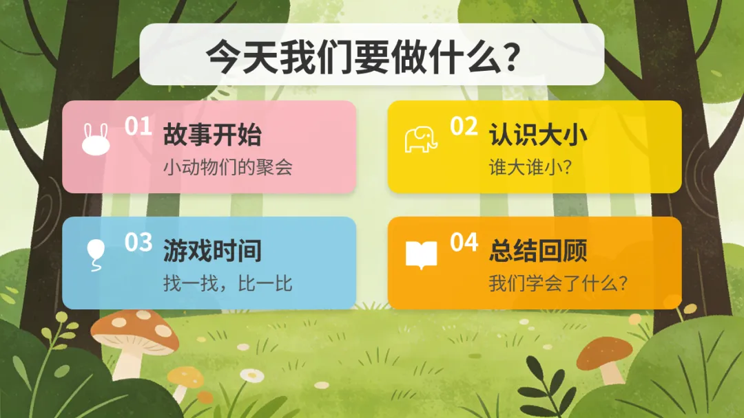 2. 播放 PPT 第 3 页:引导幼儿观察画面,提问:“看,森林里要开聚会啦!都有哪些小动物来参加了呀?”(大象、小老鼠、小兔子、小青蛙)。