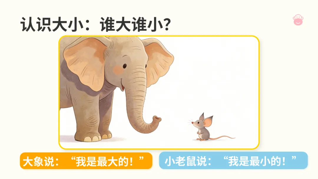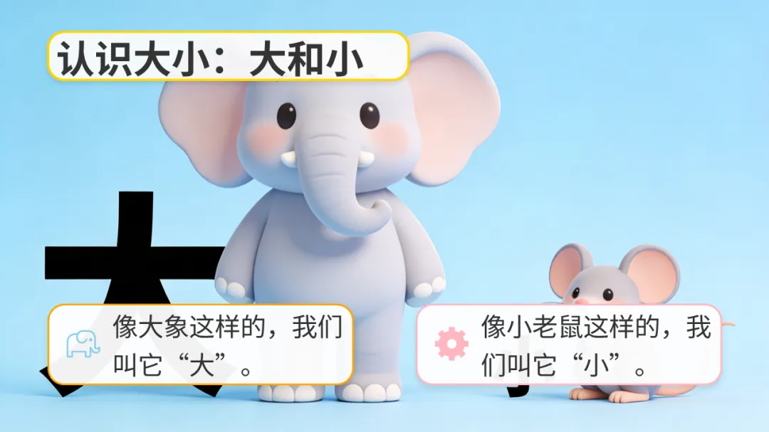 ◦ 播放 PPT 第 5 页:教师小结:“像大象这样体型非常大的,我们就用‘大’来形容。像小老鼠这样体型非常小的,我们就用‘小’来形容。”