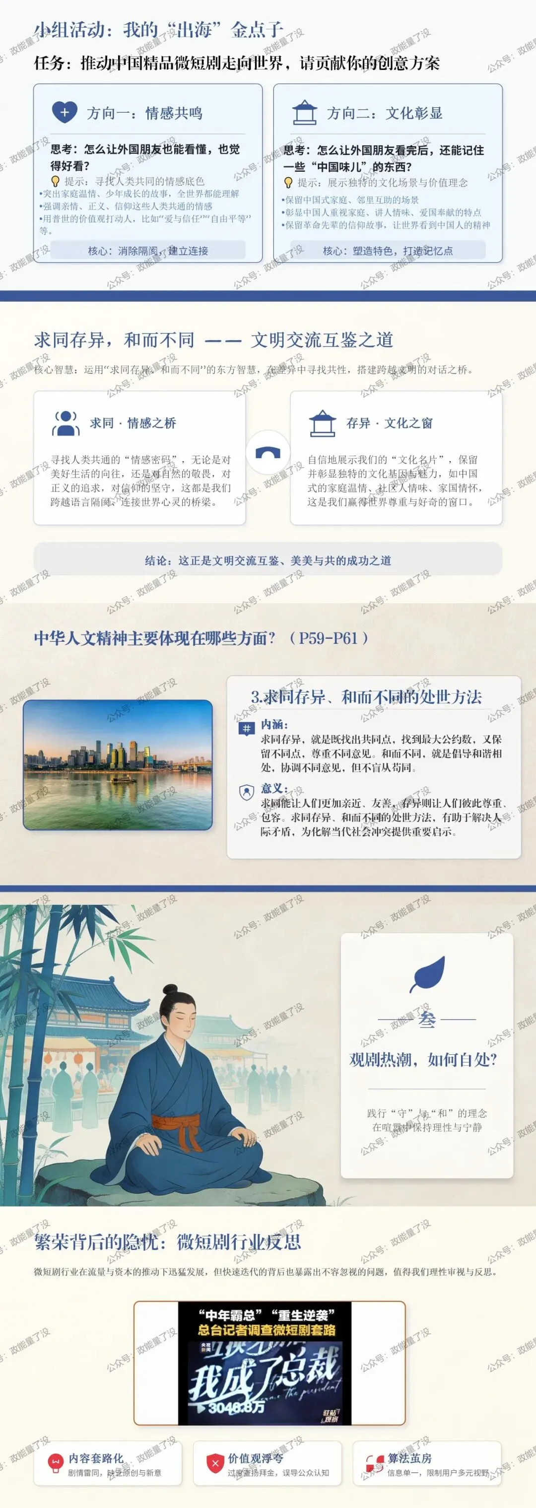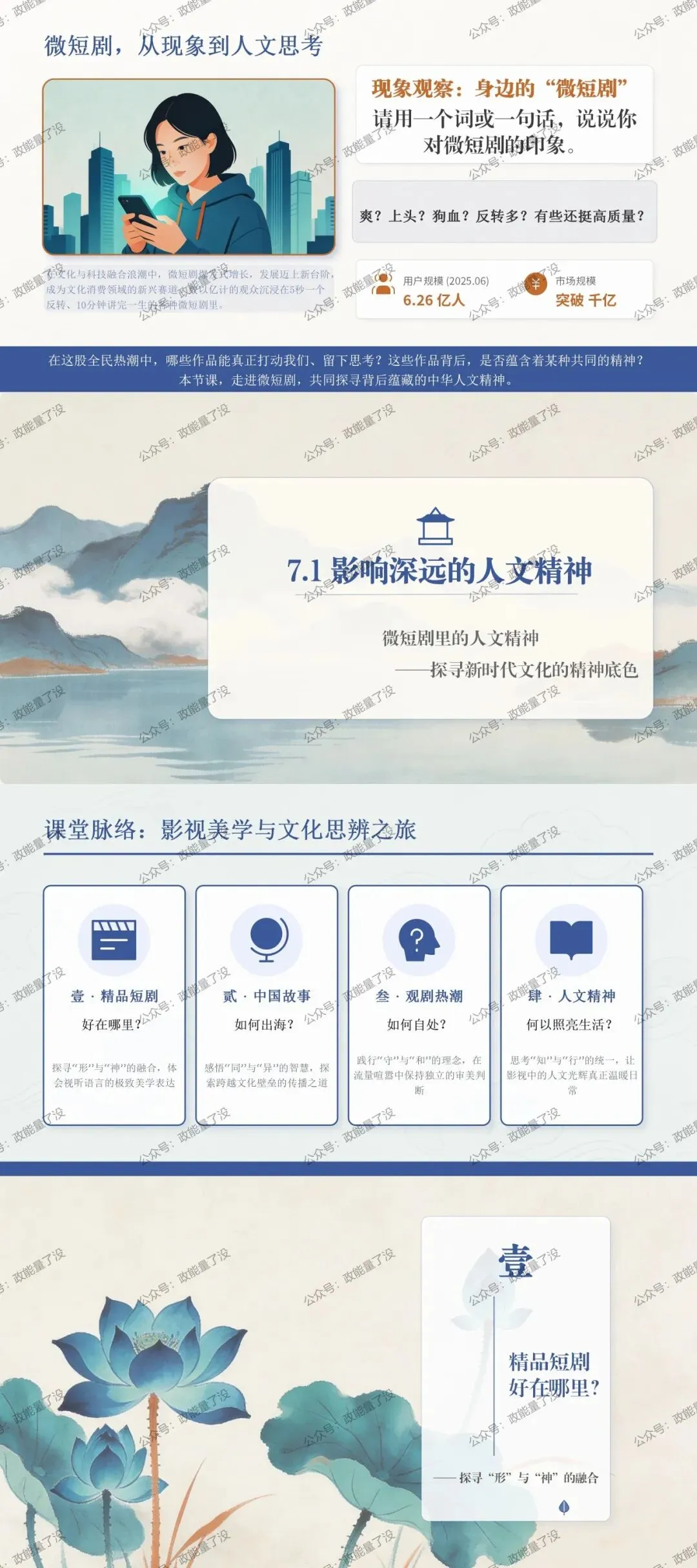 欢迎您关注并转发,购买课件请扫码底部二维码联系博主。尊重原创,抵制侵权。讲“人文精神”,容易陷入说教和空洞。学生思维活跃,但对抽象概念缺乏耐心。如何破局?我选择了他们最熟悉的文化现象——微短剧。首先,从“吐槽”切入,拉近距离。 课堂从沉迷短剧的“段子”开始,引出话题。6.26亿的用户规模数据抛出,让学生意识到:这不仅是娱乐,更是值得思考的文化现象。