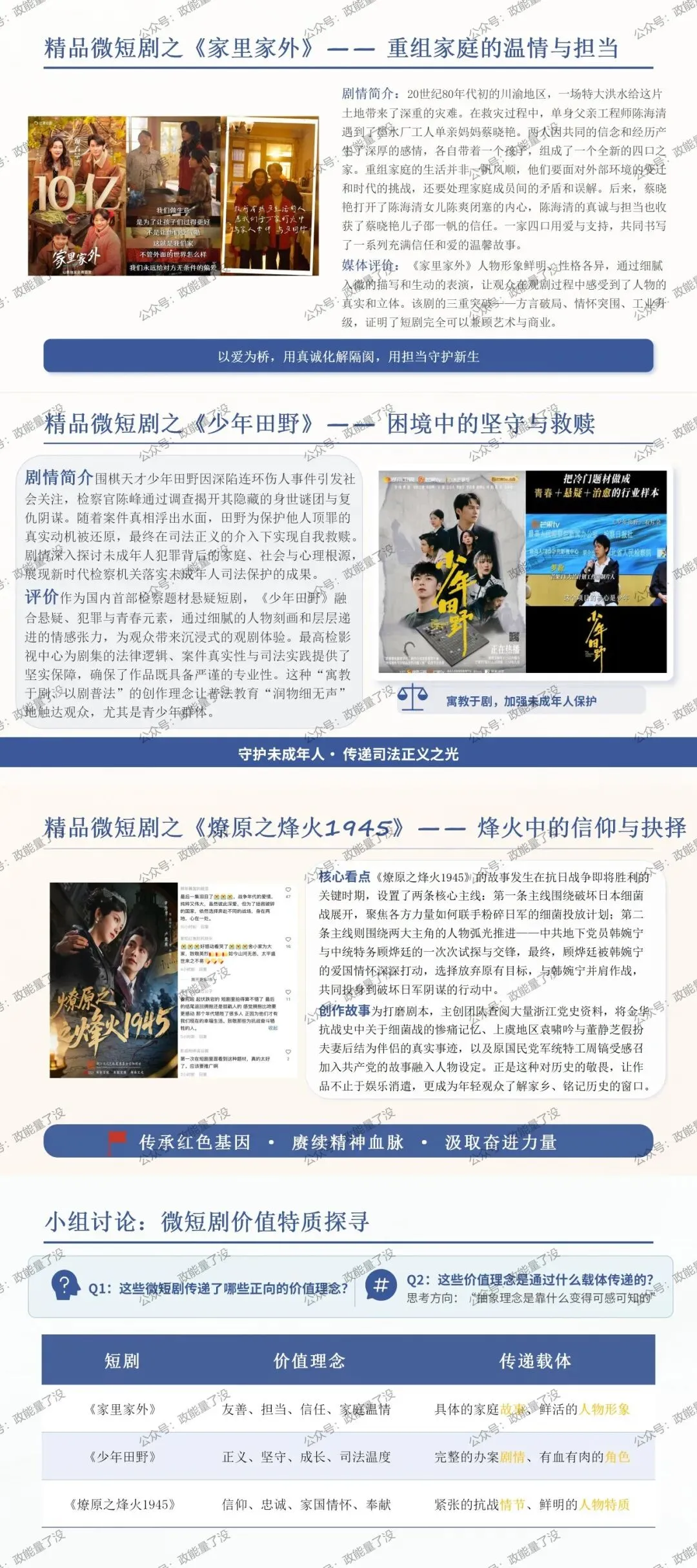 其次,用“对比”破题,化抽象为具体。 我选择了三部“清流”短剧,引导学生分析:同样是“爽”,为什么这些作品能打动人?学生在讨论中自然发现,它们是把“友善”“担当”这些价值观,化在了真实的故事和人物里。这不就是“文以载道”“形神兼备”吗?知识点不再是死记硬背,而是被学生自己“发现”的。