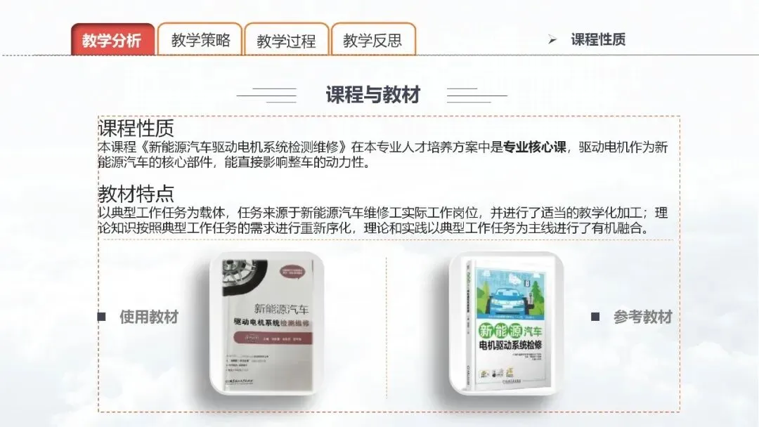 PPT 4:课程与教材是教育教学中两个不可分割的部分,本课程《新能源汽车驱动电机系统检测维修》在本专业人才培养方案中是专业核心课,作为新能源汽车的核心部件,能直接影响整车的动力性,因此掌握驱动电机的学习至关重要。我所使用的教材是北京理工大学出版社出版的《新能源汽车驱动电机系统检测维修》,其特点是以典型工作任务为载体,源于新能源汽车维修工实际工作岗位,并进行了适当的教学化加工,理论知识按照典型工作任务需求进行重新序化,理论和实践进行了有机融合。另外,我使用了机械工业出版社出版的相关教材进行了参考。