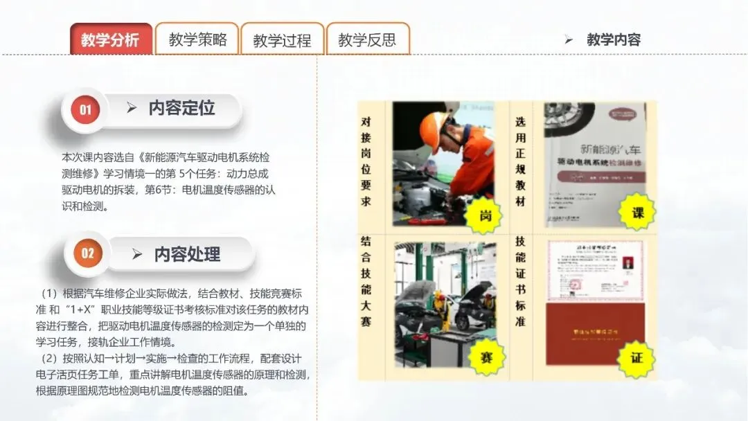 PPT 5:在教学内容上,内容的定位和处理影响着教学目标与教学策略的制定。本节课内容选自《新能源汽车驱动电机系统检测维修》学习情境一的第 5个任务:动力总成驱动电机的拆装,第6节:电机温度传感器的认识和检测。结合工作岗位要求、教材、技能大赛标准以及职业技能等级证书标准,对教学内容进行整合,把驱动电机温度传感器的检测定为一个单独的学习任务,接轨企业工作情境。根据企业工作流程,配套设计电子活页任务工单。