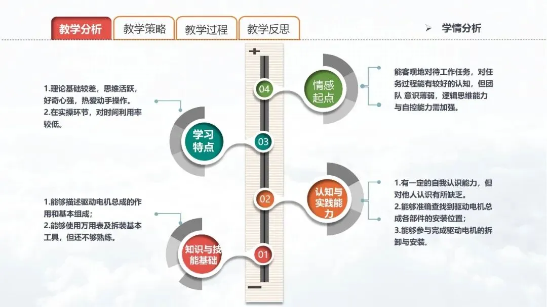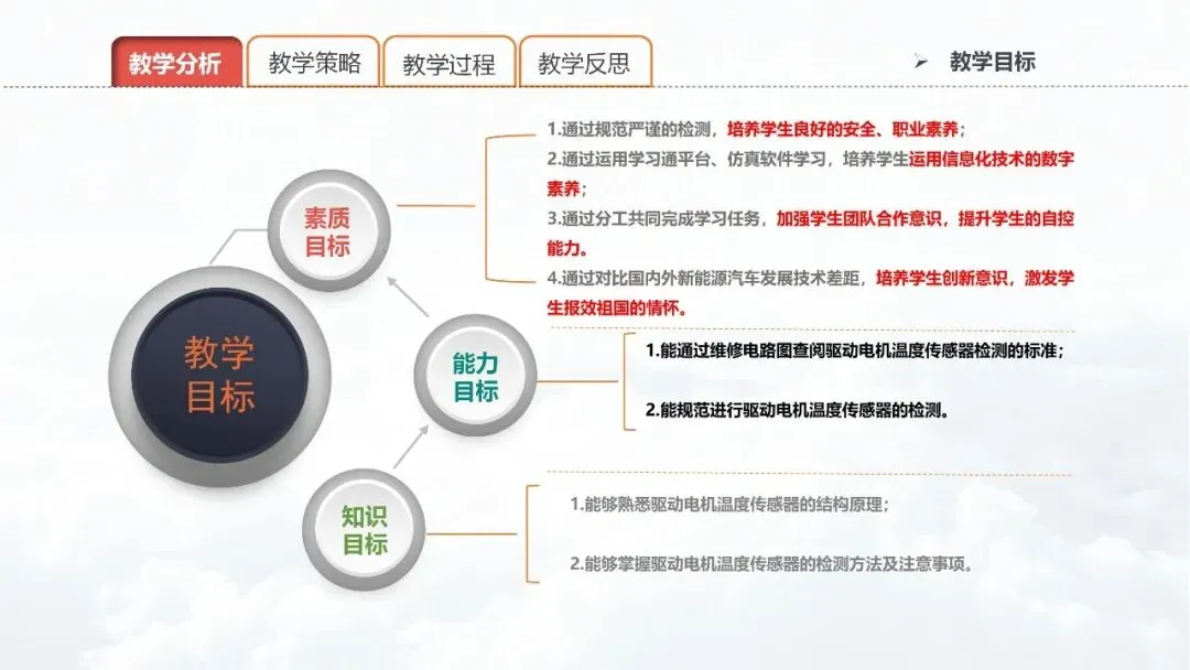 PPT 8:根据学生学情与教学内容,我从知识、能力、素质三个维度制定了本节课的教学目标。①知识目标:能够熟悉驱动电机温度传感器的结构原理; 能够掌握驱动电机温度传感器的检测方法及注意事项。②能力目标:能通过维修电路图查阅驱动电机温度传感器检测的标准; 能规范进行驱动电机温度传感器的检测。③素质目标:培养学生良好的安全、职业素养; 培养学生运用信息化技术的数字素养;加强学生团队合作意识,提升学生的自控能力。培养学生创新意识,激发学生报效祖国的情怀。