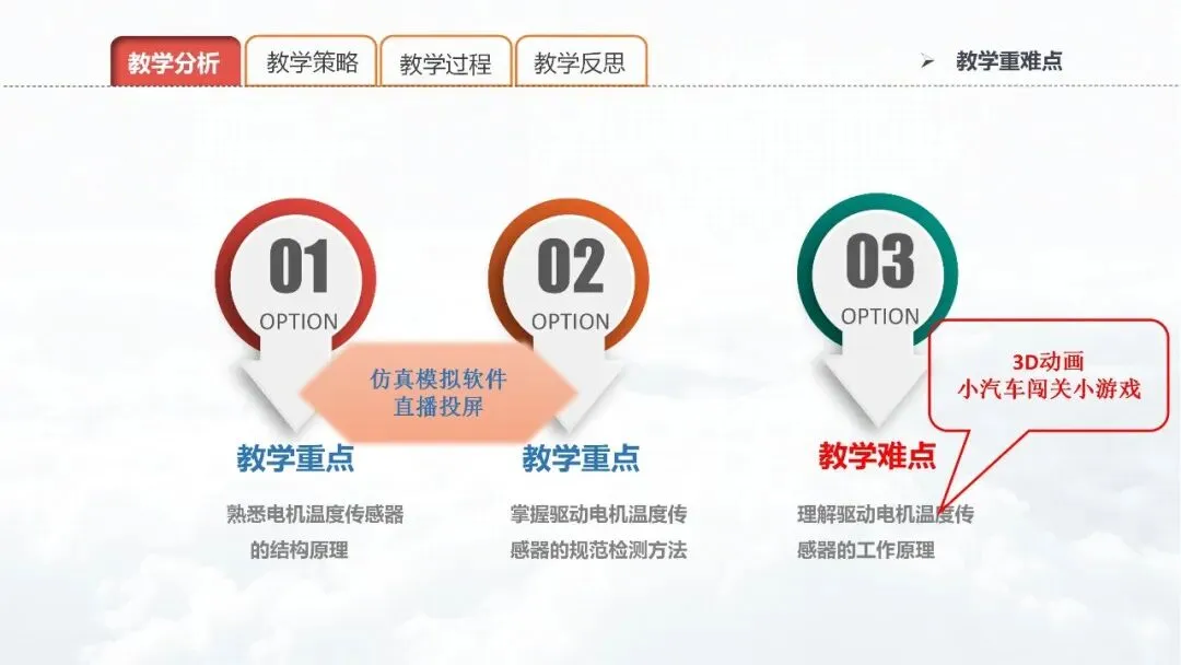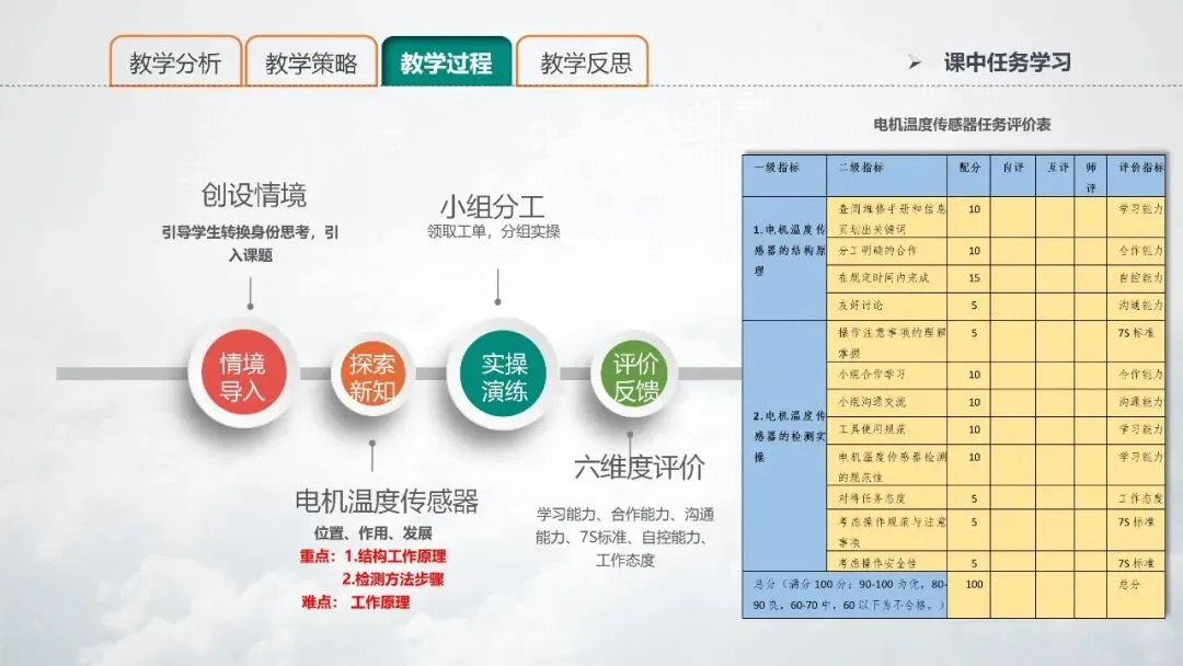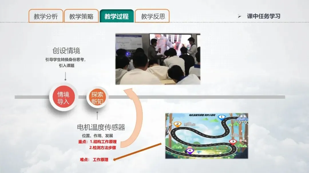 本节课的教学重点是:电机温度传感器的结构原理;驱动电机温度传感器的规范检测。解决是办法是;驱动电机仿真模拟软件、直播投屏,教学难点是理解电机温度传感器的工作原理,解决的办法是3D原理动画、闯关小游戏