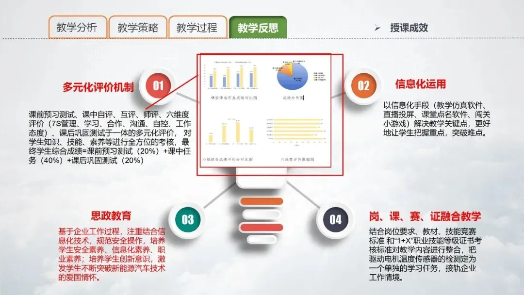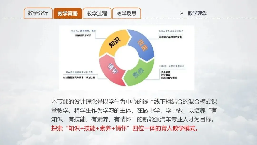 PPT 11:本节课的设计理念是以学生为中心的线上线下相结合的混合式课堂教学,将学生作为学习的主体,在做中学,学中做,以培养“有知识、有技能、有素养、有情怀”的新能源汽车专业人才为目标。探索“知识+技能+素养+情怀”四位一体的育人教学模式。