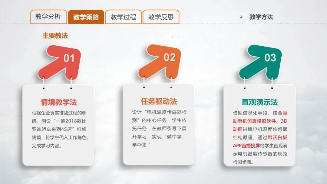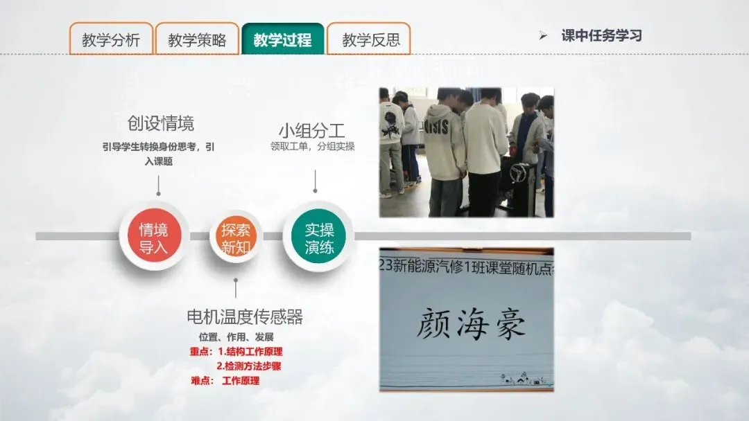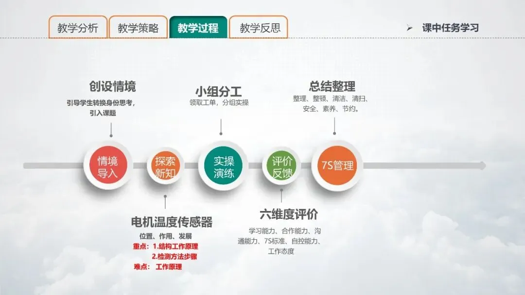 PPT 12:在本次教学中,我所采取的主要教法有:情境教学法、任务驱动法和直观演示法。其中,在直观演示法中,借助信息化手段,结合驱动电机仿真模拟软件、动画讲解电机温度传感器结构原理,通过希沃白板APP直播投屏给学生直观演示电机温度传感器的检测规范步骤。