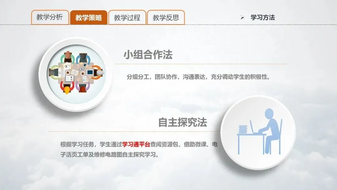 PPT 13:以学生为主体,学生的学习方法主要包括小组合作法和自主探究法。小组合作法:分组分工,团队协作,沟通表达,充分调动学生的积极性。自主探究法:学生通过学习通平台查阅资源包,借助微课、电子活页工单及维修电路图自主探究学习。