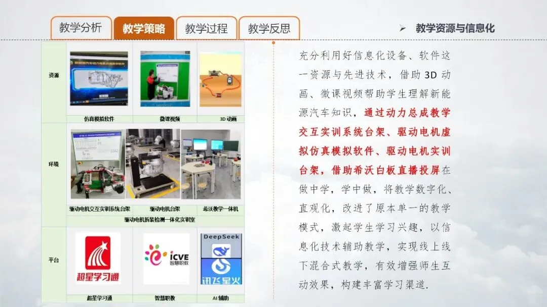 PPT 14:充分利用好信息化设备与软件技术辅助教学,能有效激发学生的学习兴趣,增强师生互动效果,提升教学质量。我所使用的教学资源是驱动电机模拟软件、驱动电机微课视频、3D原理动画,教学环境是驱动电机拆装与检测一体化实训室,配有驱动电机系统交互实训台架、驱动电机台架、希沃教学一体机;借助的教学平台有超星学习通、智慧职教、AI辅助软件等。