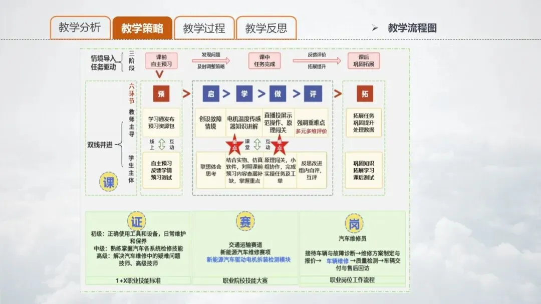 PPT 15:结合岗、课、赛、证,针对本节课内容,我设计了三阶段六环节双线并进的教学流程图。课前通过学习通预习,课中结合信息化设备与软件,通过启、学、做、评四个环节突出重点,突破难点,完成教学任务,课后巩固延伸学习,处理数据等,培养知识,技能,素养,情怀一体的新能源汽车专业人才。