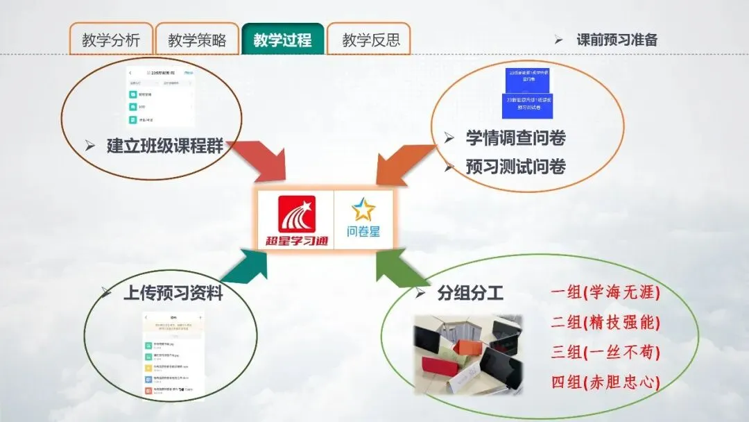 PPT 17:课前预习准备,基于学习通平台,建立班级课群,上传预习资料,运用问卷星设计学情调查问卷和预习测试问卷上传学习通班级课群。分组分工,每个小组的组名分别对应知识、技能、素养、情怀,明确分工细则。