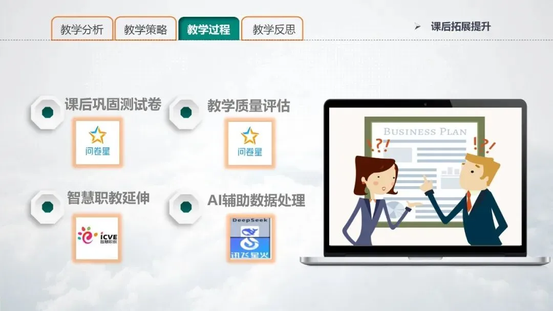 PPT 22:课后拓展提升环节,在学习通上发布课后巩固测试卷、教学质量评估问卷,借助智慧职教资源延伸学习,利用AI软件辅助评价数据处理