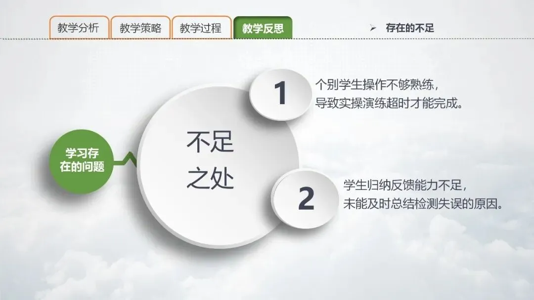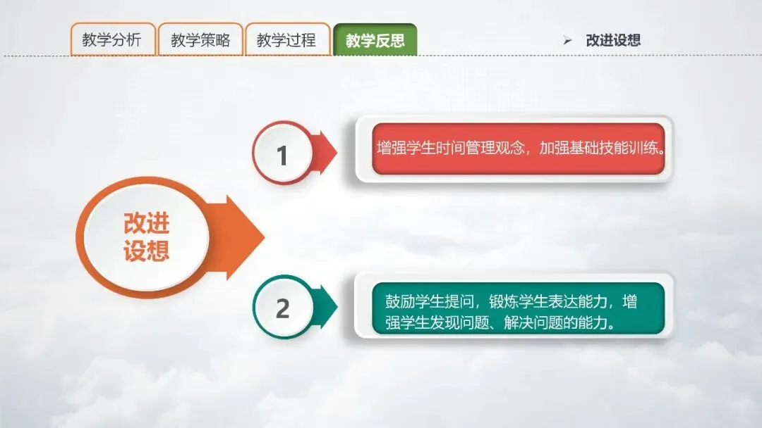 PPT 26:针对以上两点不足,提出以上改进设想:①增强学生时间管理观念,加强基础技能训练。②鼓励学生提问,锻炼学生表达能力,增强学生发现问题、解决问题的能力。
