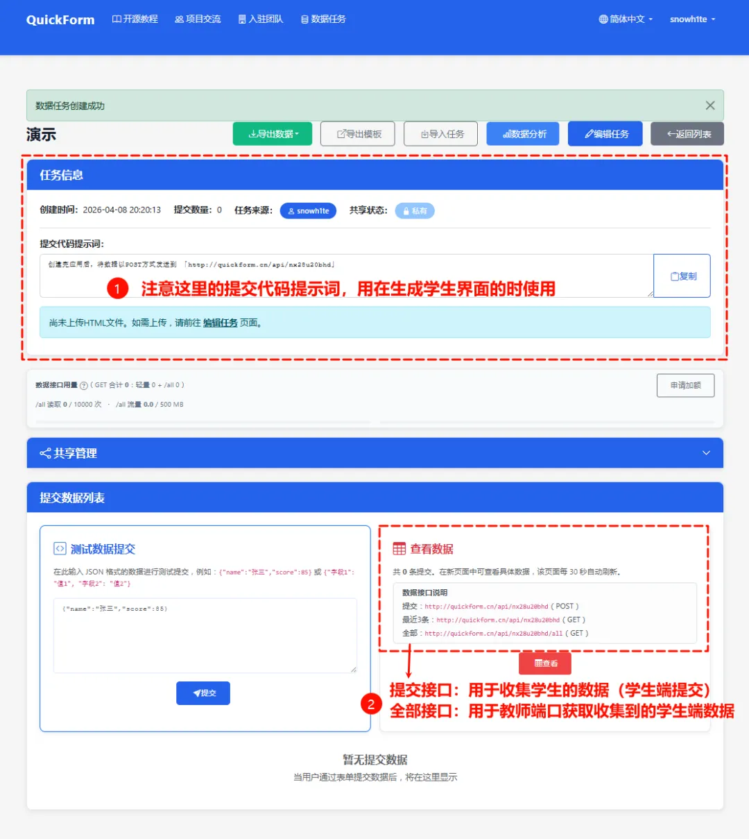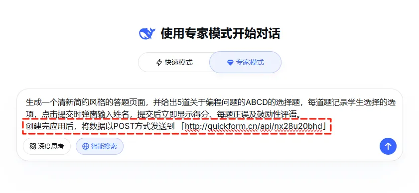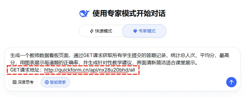 · 建基站:登录 quickform.cn 新建任务,复制生成的专属 API 地址(这串网址就是你的数据收件箱)。· 发指令:用AI做网页时,提示词里多加一句话:“请将所有提交数据通过API发送至 [粘贴你的地址]”。(刚好今天DeepSeek上线了专家模式,上手试试)· 等数据:把网页链接发给学生,他们一操作,数据自动入库。· 看大屏:再用AI生成个数据大屏网页链接那个API,全班进度实时滚动。学生端提示词: