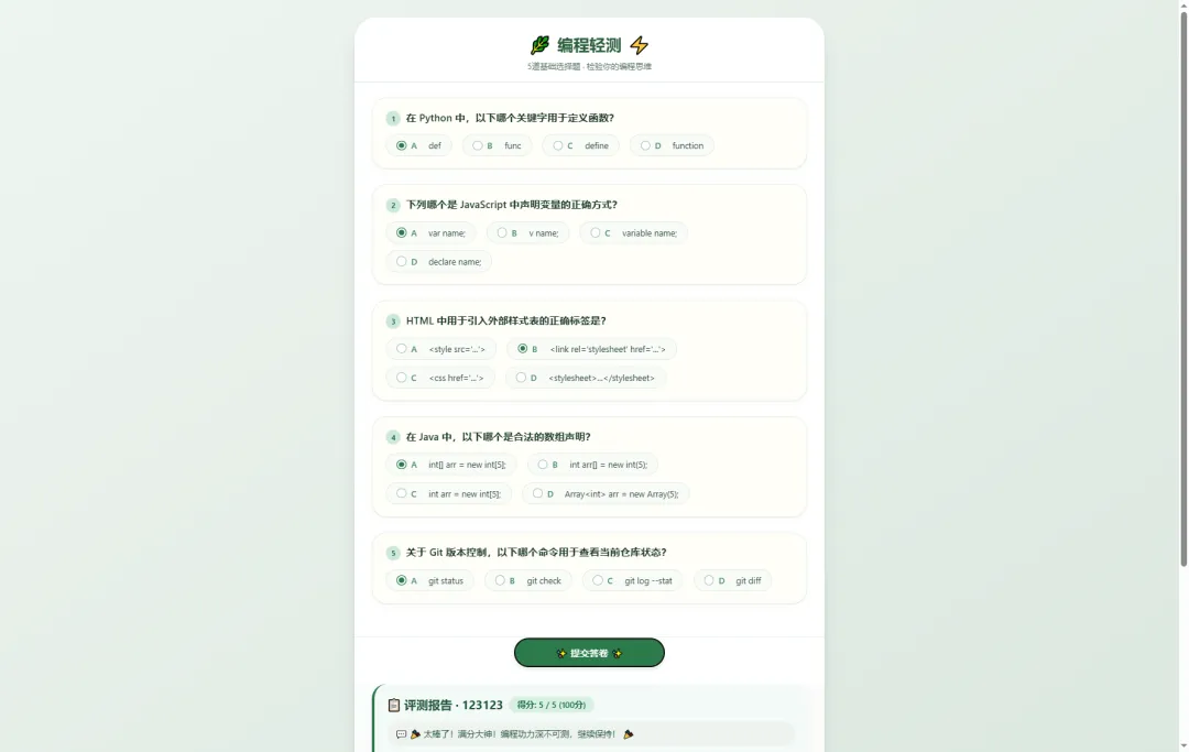 生成一个清新简约风格的答题页面,并给出5道关于编程问题的ABCD的选择题,每道题记录学生选择的选项,点击提交时弹窗输入姓名,提交后立即显示得分、每题正误及鼓励性评语。创建完应用后,将数据以POST方式发送到 「*****」 //替换自己的POST地址