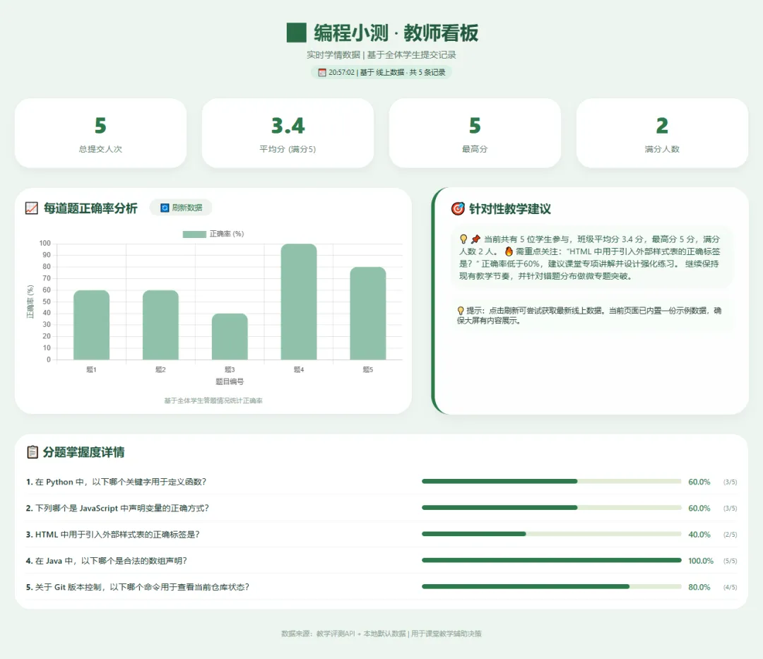 生成一个教师数据看板页面,通过GET请求获取所有学生提交的答题记录,统计总人次、平均分、最高分,用图表展示每道题的正确率,并生成针对性教学建议,界面清新简洁适合课堂展示。GET请求地址:「*****」 //替换成自己的GET地址