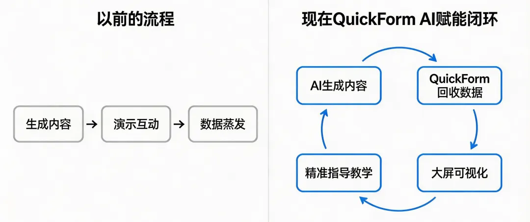 现在变成了闭环:AI生成内容 → QuickForm回收数据 → 大屏可视化 → 精准指导教学。