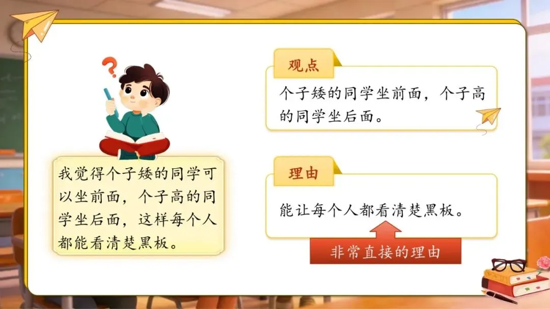 口语交际应该怎样安排座位发言方法:先表明观点→再说清楚理由交际小贴士: