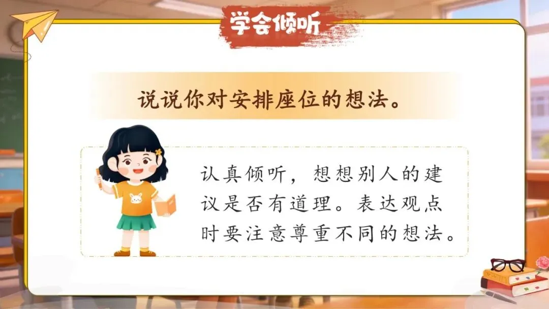 教材呈现了3个学习伙伴的想法:按身高安排座位、前后排定期轮换、桌椅分小组摆放,三种想法各有角度,示范了"先表明观点,再说清楚理由"的表达方式。教材同时提出了两条交际小贴士:认真倾听,想想别人的建议是否有道理;表达观点时要注意尊重不同的想法。这两条小贴士分别从"倾听"和"表达"两个维度提出要求,是本次口语交际的学习重点。
