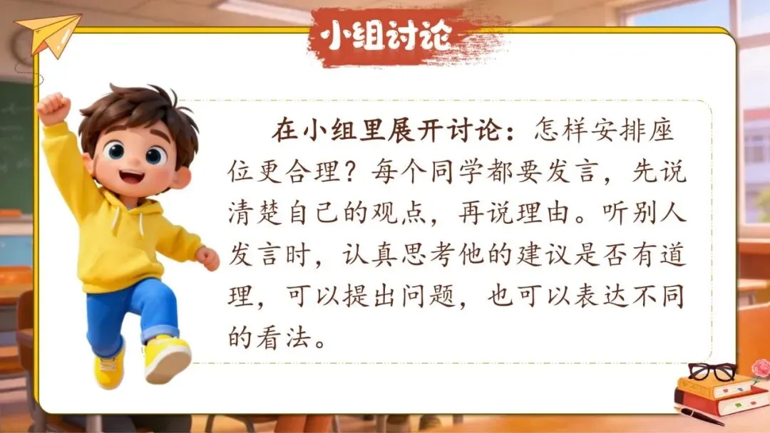 师:看来,座位的安排真是一件大事,关系到每个同学的学习和生活。那么,怎样安排座位才更合适呢?今天我们就来认认真真地讨论这个问题,把我们的想法整理成一份"班级座位调整建议书",交给老师参考!