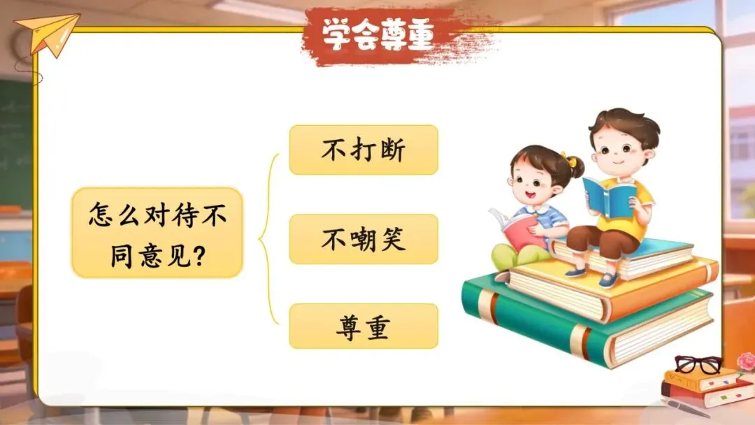 表达观点时注意尊重不同的想法,做文明有礼的交际者。