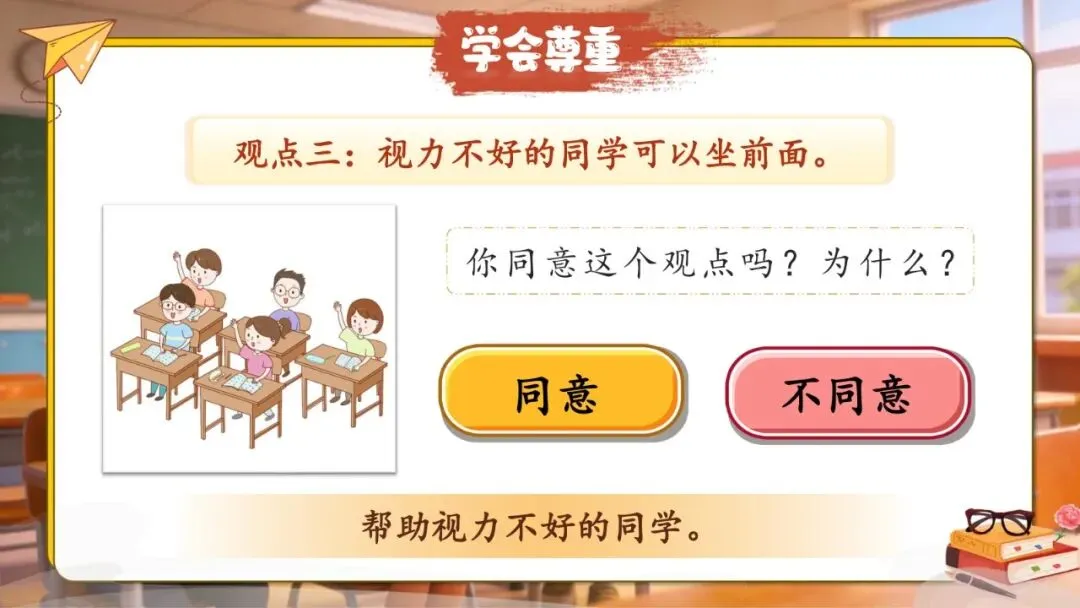师:同学们提出了这么多不同的建议,有的我们意见一致,有的还存在不同看法。这很正常,因为每个人的需求和感受都不一样。正是因为我们尊重不同的想法,大家才能一起讨论出更合理的方案。