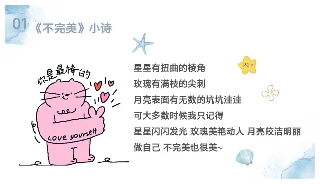 这里有一首《不完美》的小诗想和大家分享:星星有扭曲的棱角,玫瑰有满枝的尖刺,月亮表面有无数的坑坑洼洼,可大多数时候我只记得,星星闪闪发光,玫瑰美艳动人,月亮皎洁明丽。其实这就像我们自己,做自己,不完美也很美。