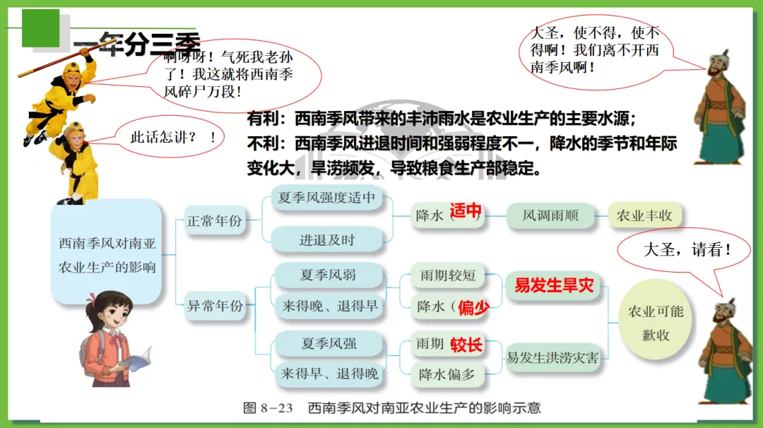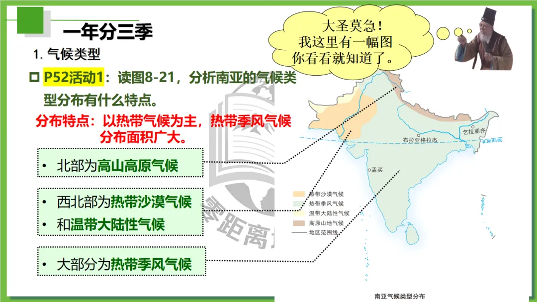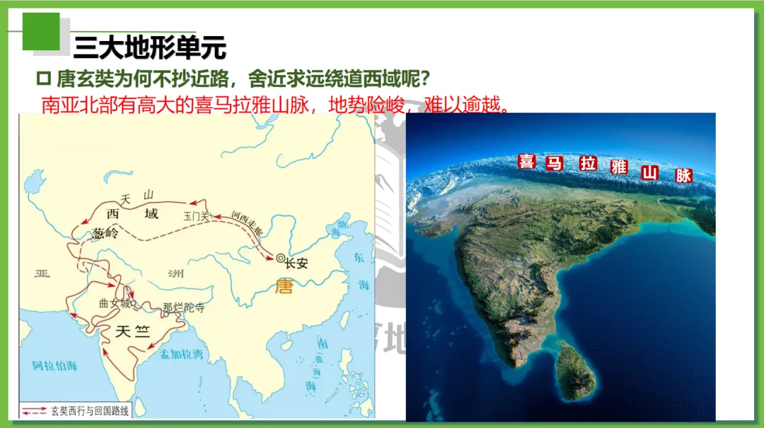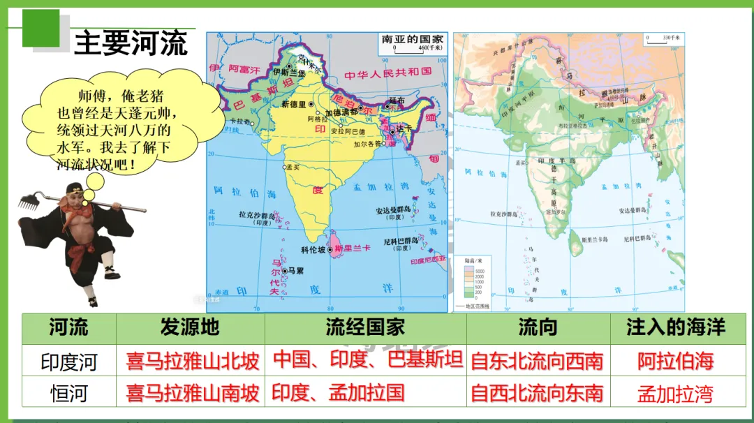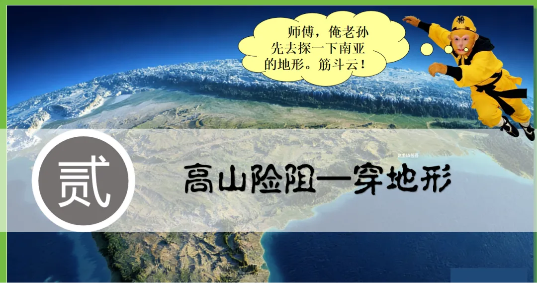 本课以唐僧师徒西天取经为主线,创设“取经启程(定位南亚)→ 高山险阻—穿地形→风雨考验—识气候→ 途经村落—看农业→ 参拜圣寺(悟文化)→ 取经归来(总特征)”故事线索,将南亚地理知识点(位置、地形、气候、河流、农业、宗教文化)融入师徒取经的每一个关键节点,实现“故事情境+地理知识+核心素养”三维融合,兼顾趣味性和知识性,适配初中地理课堂,帮助学生快速理解、记忆南亚区域特征,树立人地协调观和区域认知。