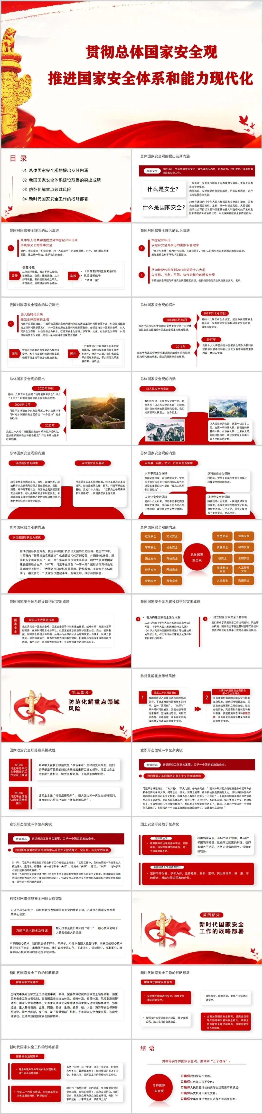 本期课件着重阐述总体国家安全观的提出与丰富内涵,晾晒我国国家安全体系建设取得的突出成绩,深入阐述防范化解重点领域风险和新时代国家安全工作的战略部署。因篇幅有限,仅展示部分内容。