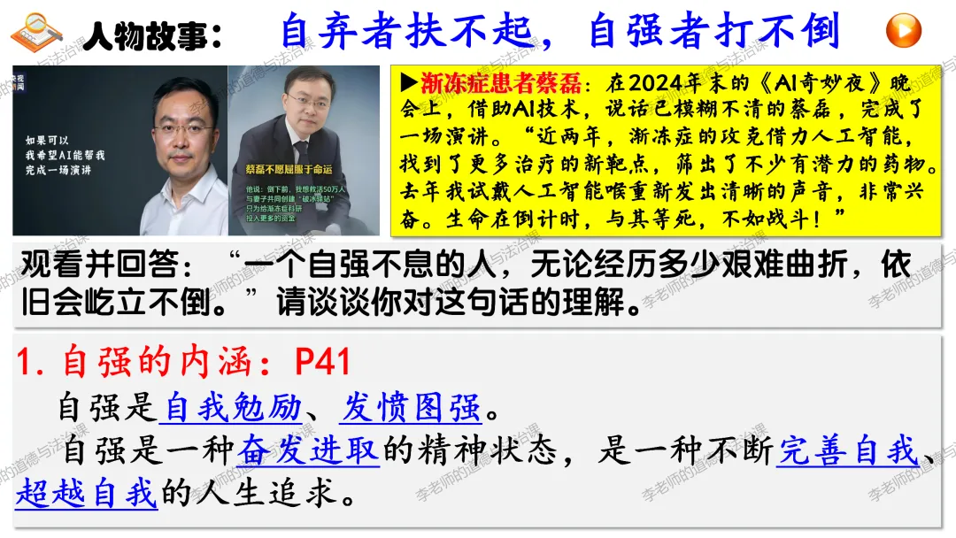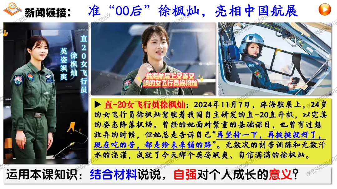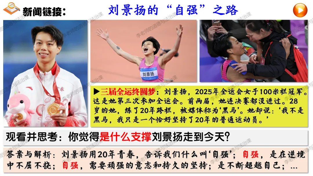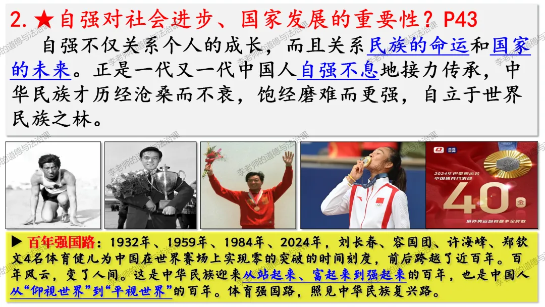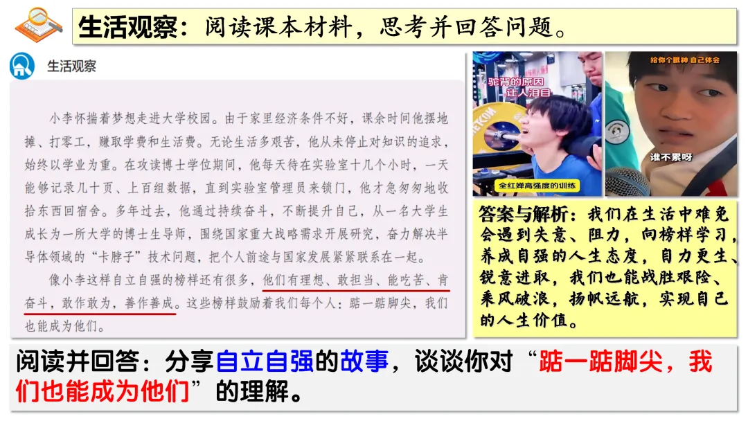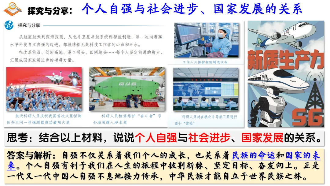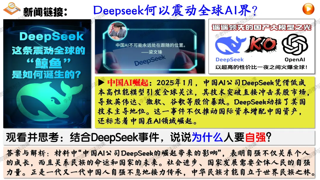 ▲通过思考中国AI公司DeepSeek事件,通过展示我国科技领域、体育领域取得的巨大成就以及这些成就背后无数人的辛苦付出,引导学生正确认识个人自强与社会进步、国家发展的关系,知道正是每个中国人的不懈奋斗汇聚起中华民族持续发展的磅礴力量,懂得要为实现中华民族伟大复兴贡献自己的力量。。