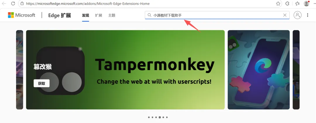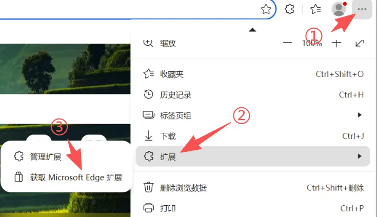 点击浏览器右上角的三个小点(···),选择“扩展”-“获取Microsoft Edge扩展”。