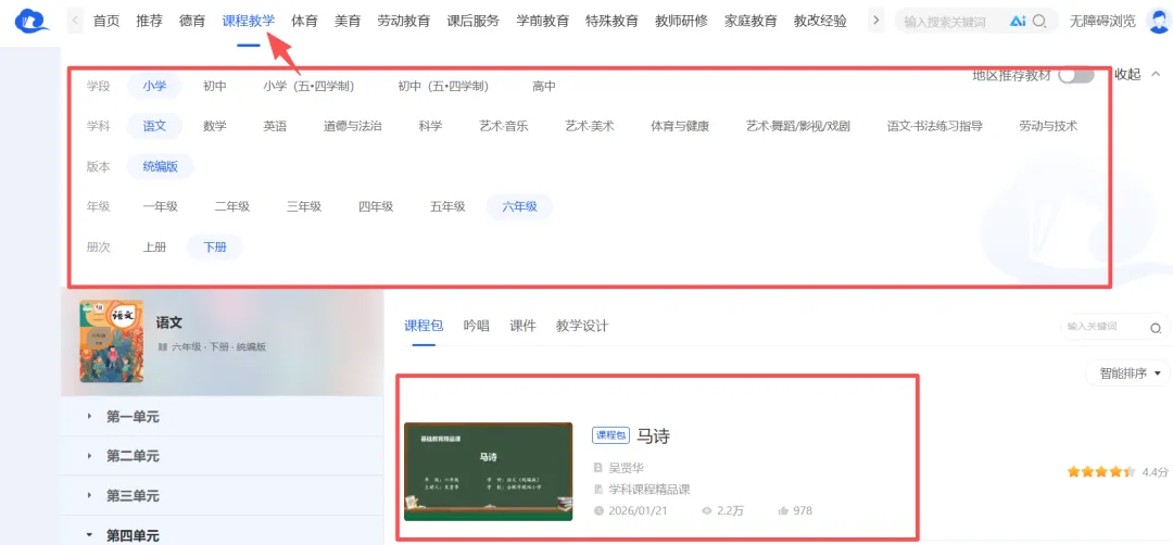 点击“课程教学”,选择自己想要的教学资源,并点击进入对应的教学资源(
