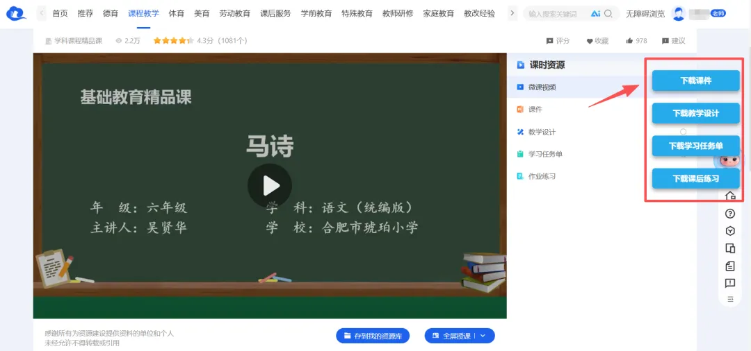 “下载神器”发挥作用了,可以看到教学资源右侧凭空多出了4个下载按钮,想要什么资料一键下载即可!简直太方便了~