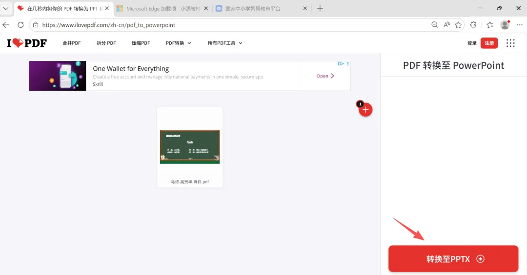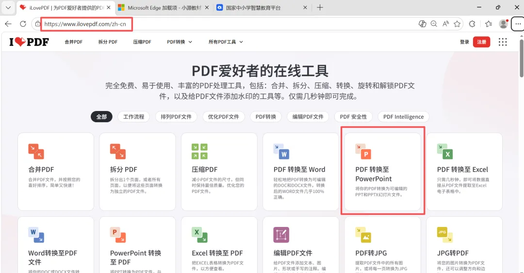 打开在线转换工具,直接把以下截图中的网址输入到浏览器的地址栏中并打开(这里就不用一定要在Edge浏览器了),再单击“PDF转换至PowerPoint”。(网址我也放在评论区了)
