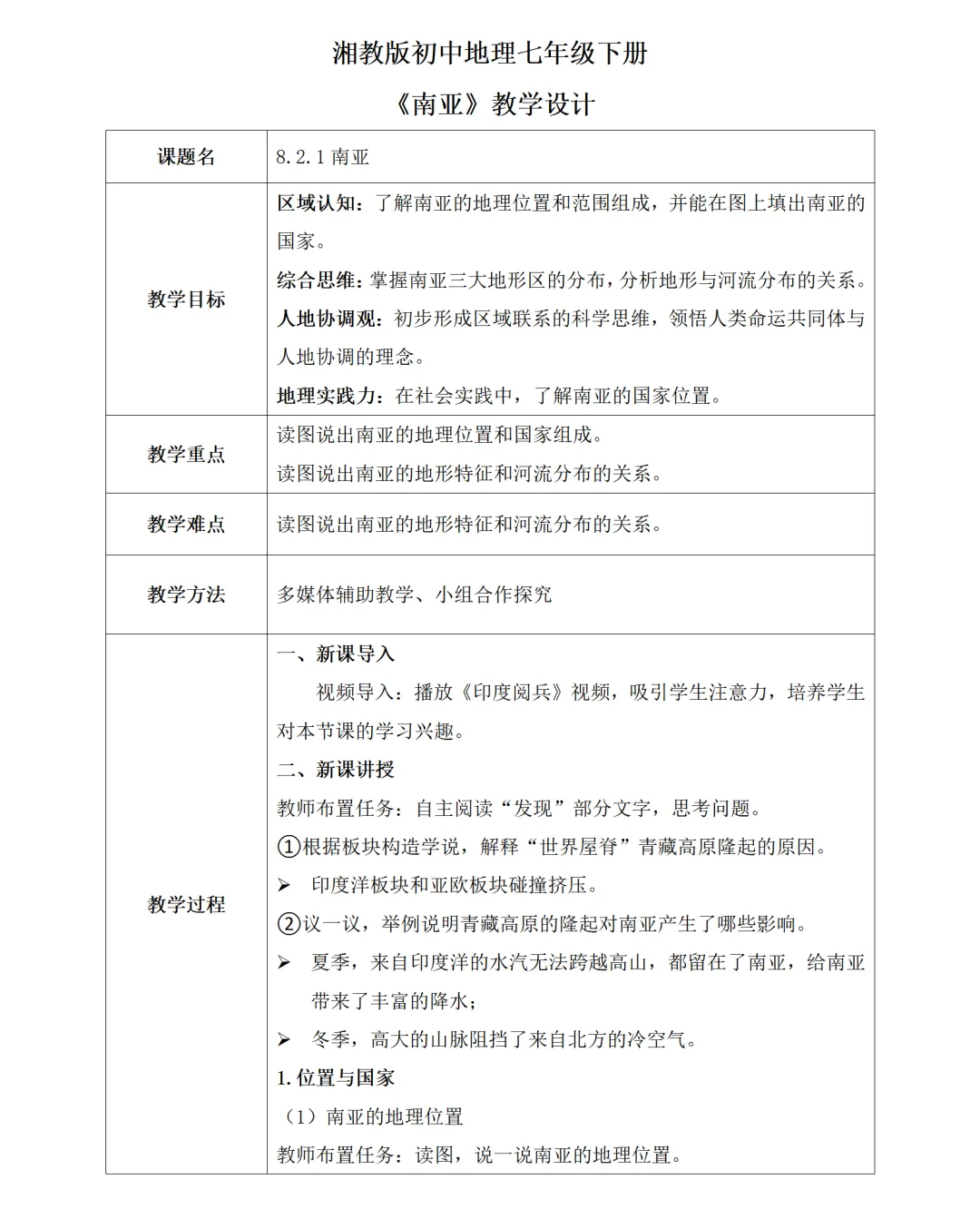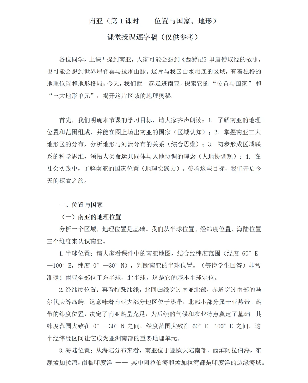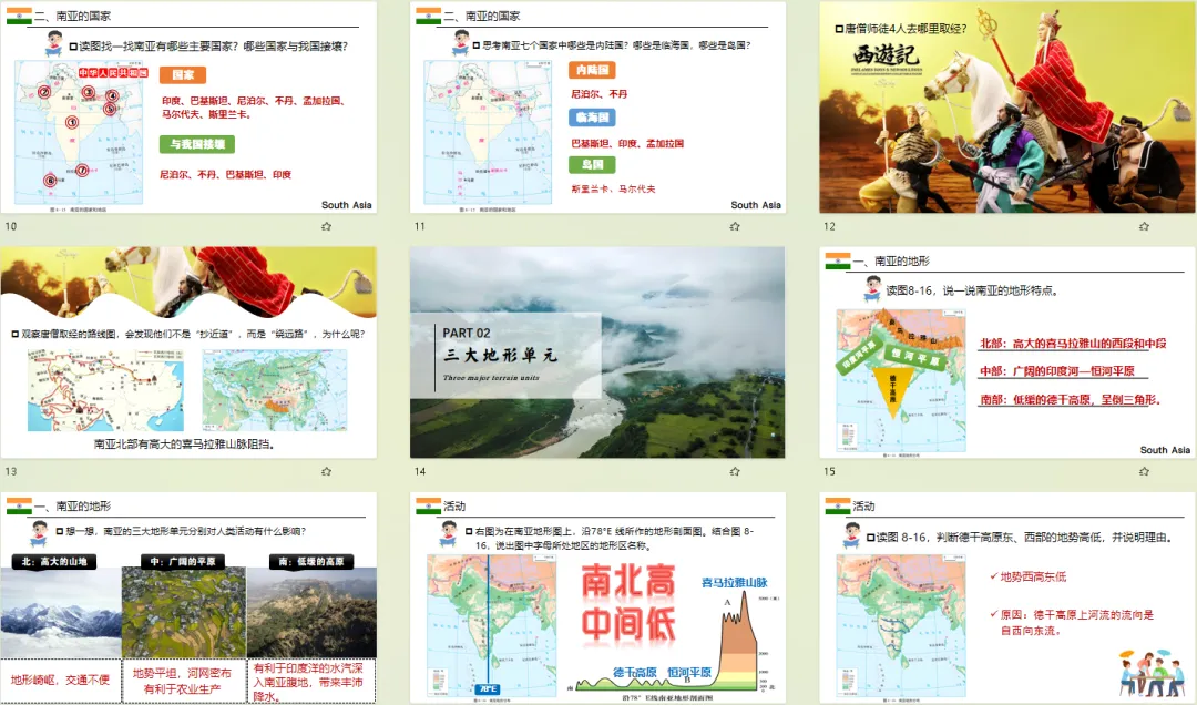 遵循 “位置 — 国家 — 地形” 的区域地理经典教学思路,由浅入深、层层递进,符合初一学生从基础认知到综合分析的思维特点,降低区域地理的学习难度。