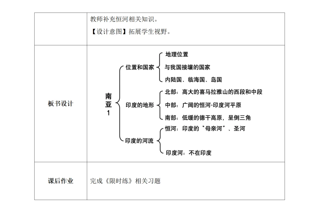 板书设计高度凝练本课时核心知识,以 “位置与国家 — 地形 — 河流” 为主线,梳理地理位置、地形特征、河流水文等关键内容,让学生形成清晰的知识框架;课后布置《限时练》相关习题,实现学练结合,精准巩固课堂所学的基础知识点。