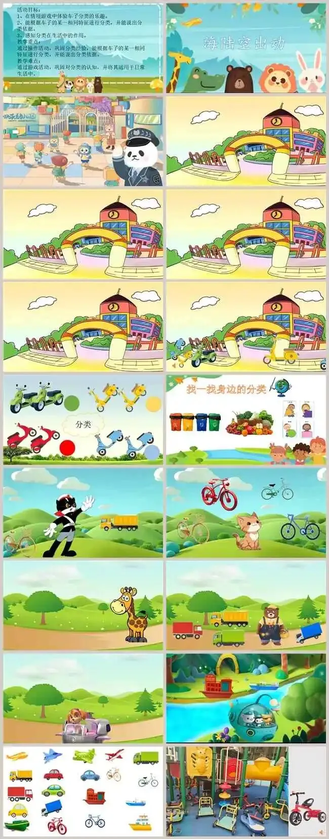 经验准备:幼儿已有的关于交通工具、颜色、场景的认知经验储备。