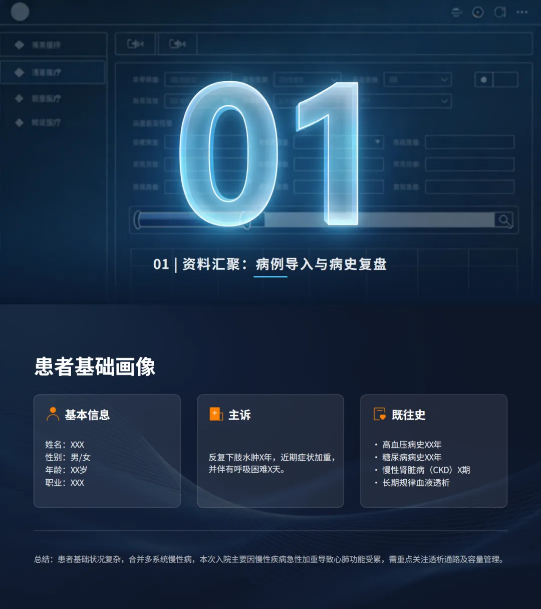 1. 内容: 【PPT课件】慢性肾脏病(CKD)合并心衰护理查房:容量管理、血液净化与饮食图解,PPT+宣讲稿