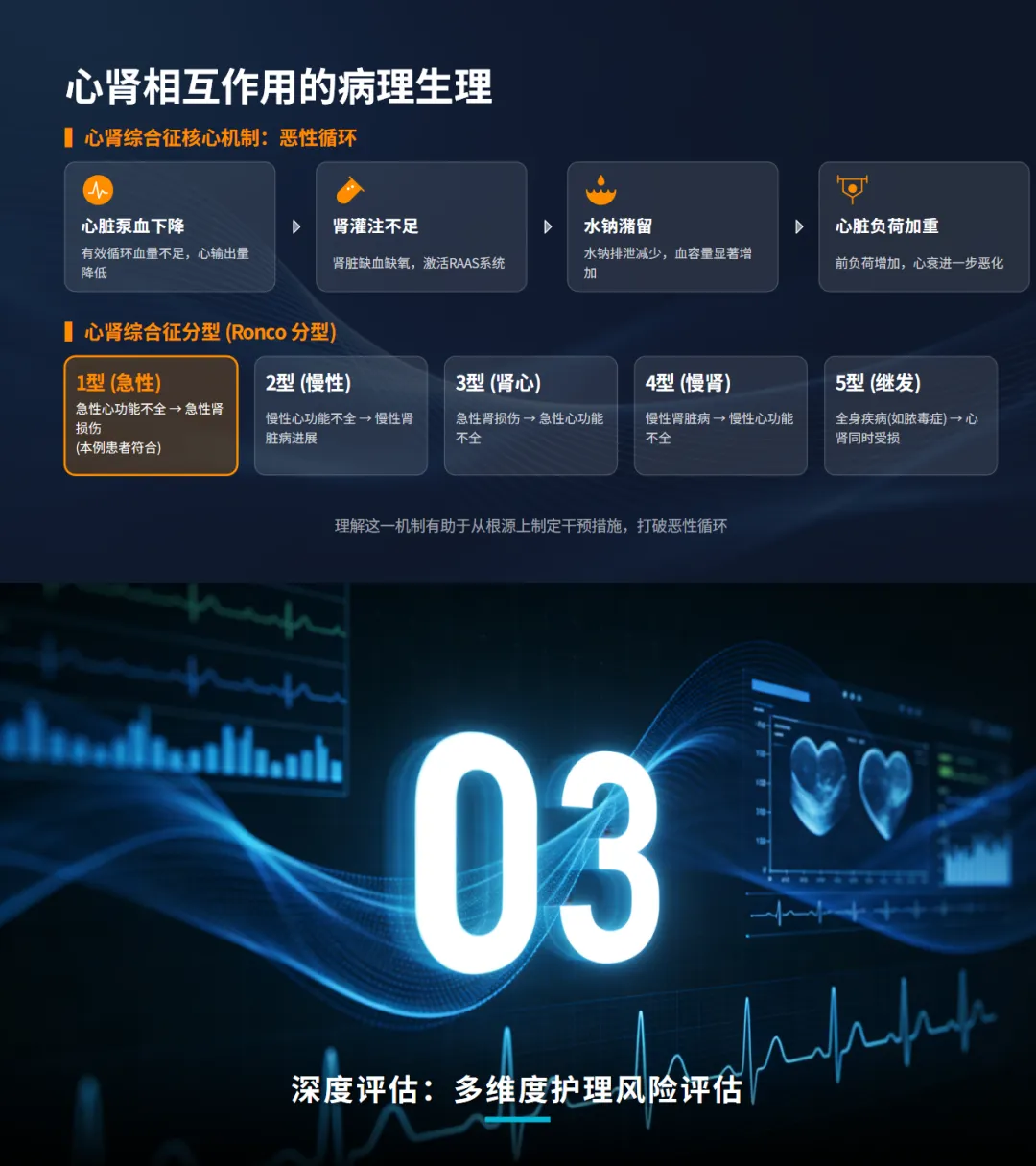 当慢性肾脏病(CKD)遇上心力衰竭(HF),患者往往面临着极大的生存挑战。这并非两种疾病的简单叠加,而是演变为复杂的心肾综合征(CRS)。由于心肾功能相互拖累,这类患者的病情往往错综复杂,极易因感染或劳累诱发急性加重。本文将结合临床真实护理查房记录,为您深度拆解CKD合并心衰患者的多维度精准护理与核心干预路径。