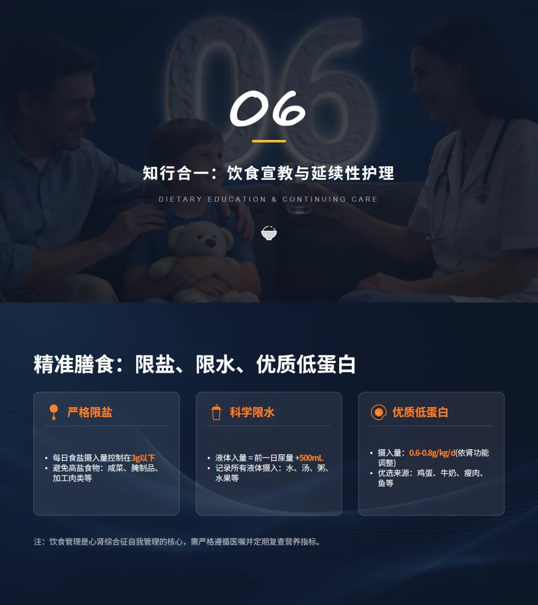 • 苛刻的限盐限水:强调“隐形盐”的危害,每日食盐摄入量严格控制在3g以内。指导患者使用带刻度的水杯,根据前一日尿量科学计算当日饮水量,做到“量出为入”。