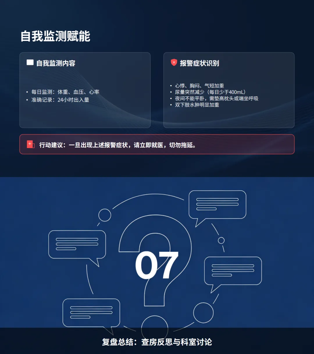 • 自我体征监测:教会患者及家属每日定时、定秤、空腹测量体重。若体重在短时间内急剧增加(如1-2天内增加>2kg),或出现夜间阵发性呼吸困难、下肢水肿加重,应立即就医。