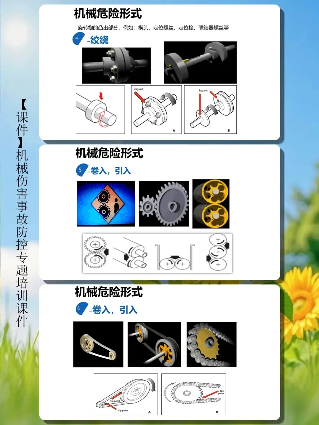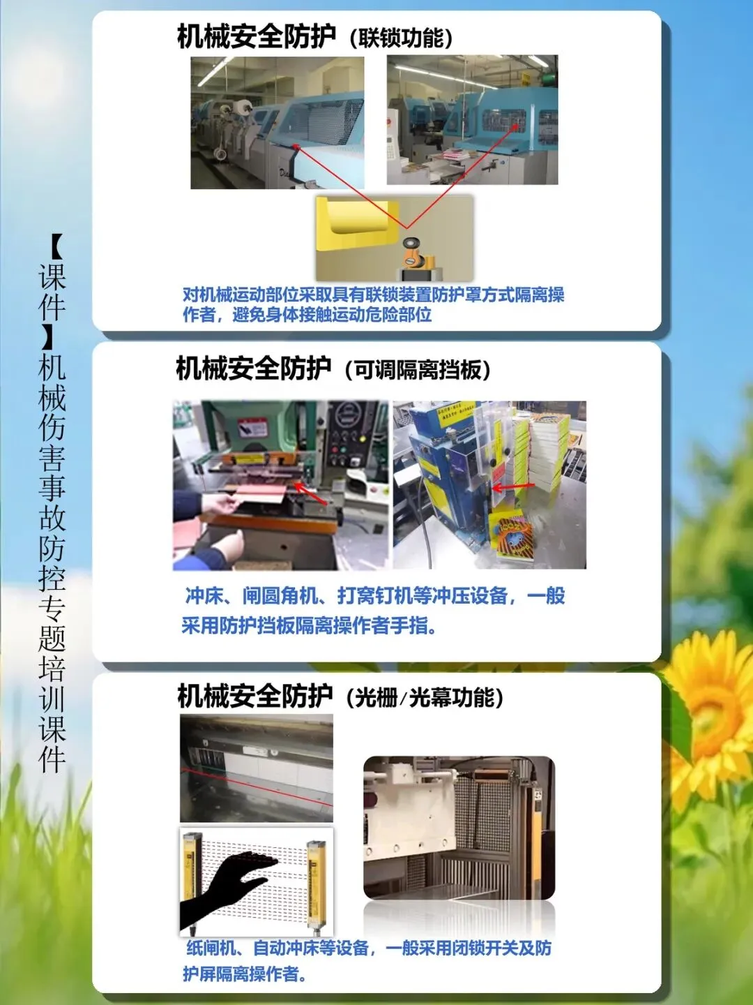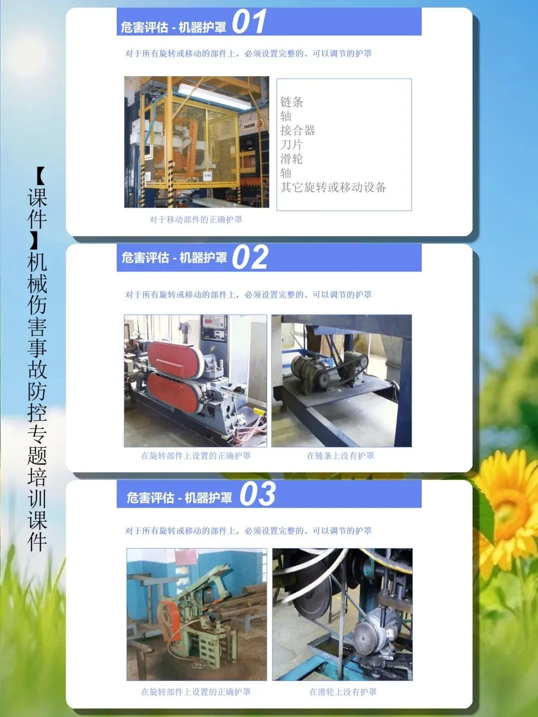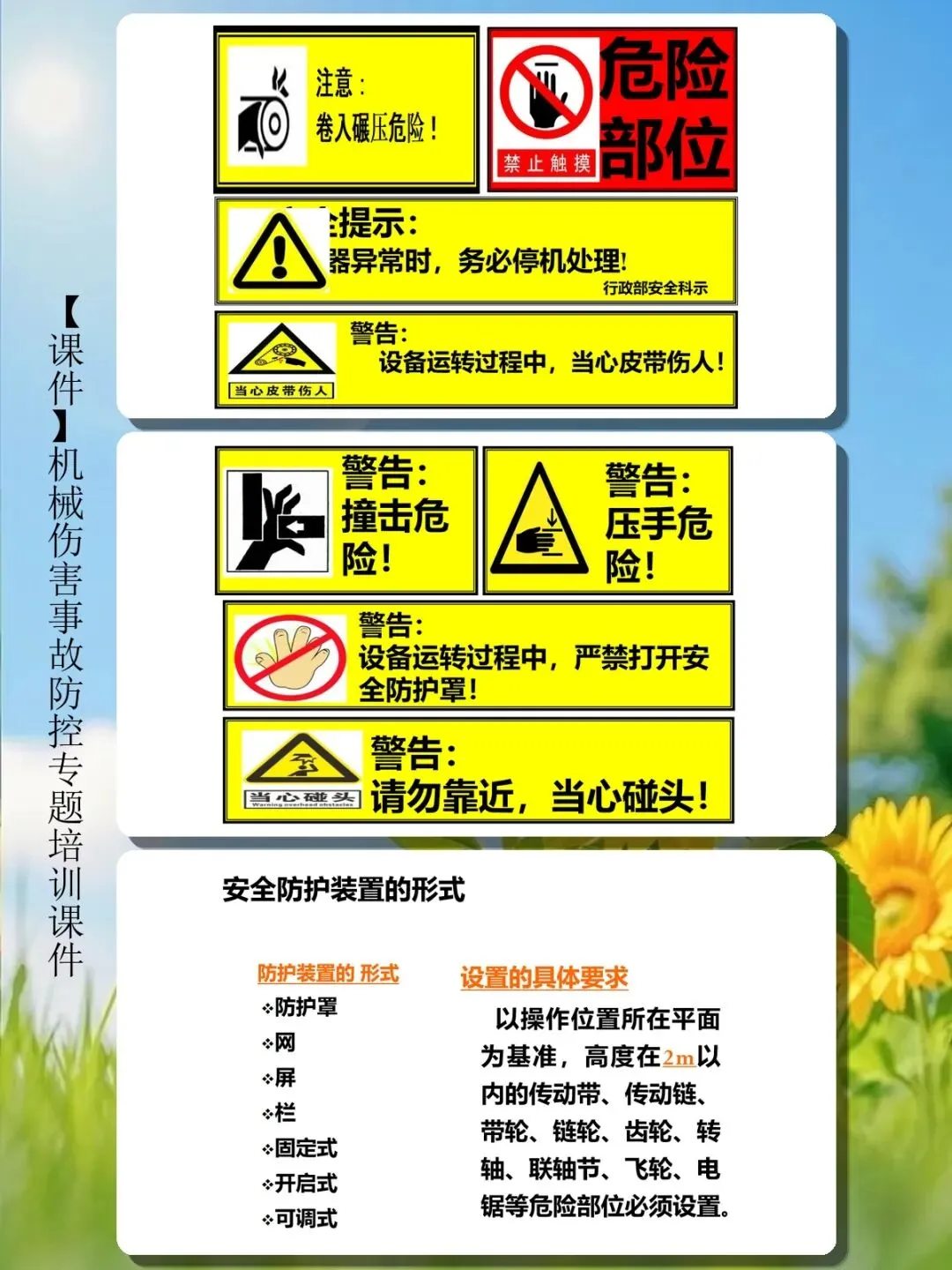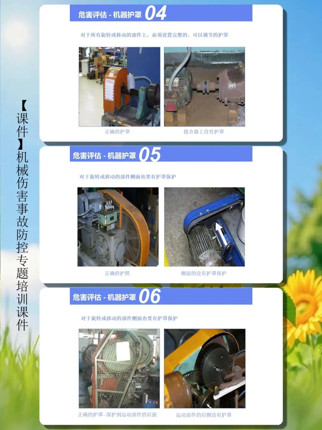 "四必有"原则:有轴必有套,转动滚轴必须设置防护套,防止头发、衣领、袖口被卷入;有轮必有罩,皮带轮、齿轮、链条等传动部位必须设置固定式防护罩;有台必有栏,设备平台高度超过1.2米必须设置护栏;有洞必有盖,设备上的孔洞位置必须设置盖板。