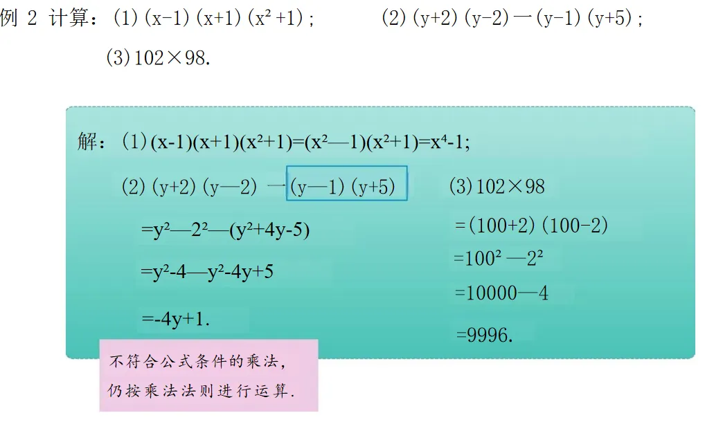 (1) 连乘:(x−1)(x+1)(x2+1)(2) 混合运算:(y+2)(y−2)−(y−1)(y+5)(3) 简便计算:102×98