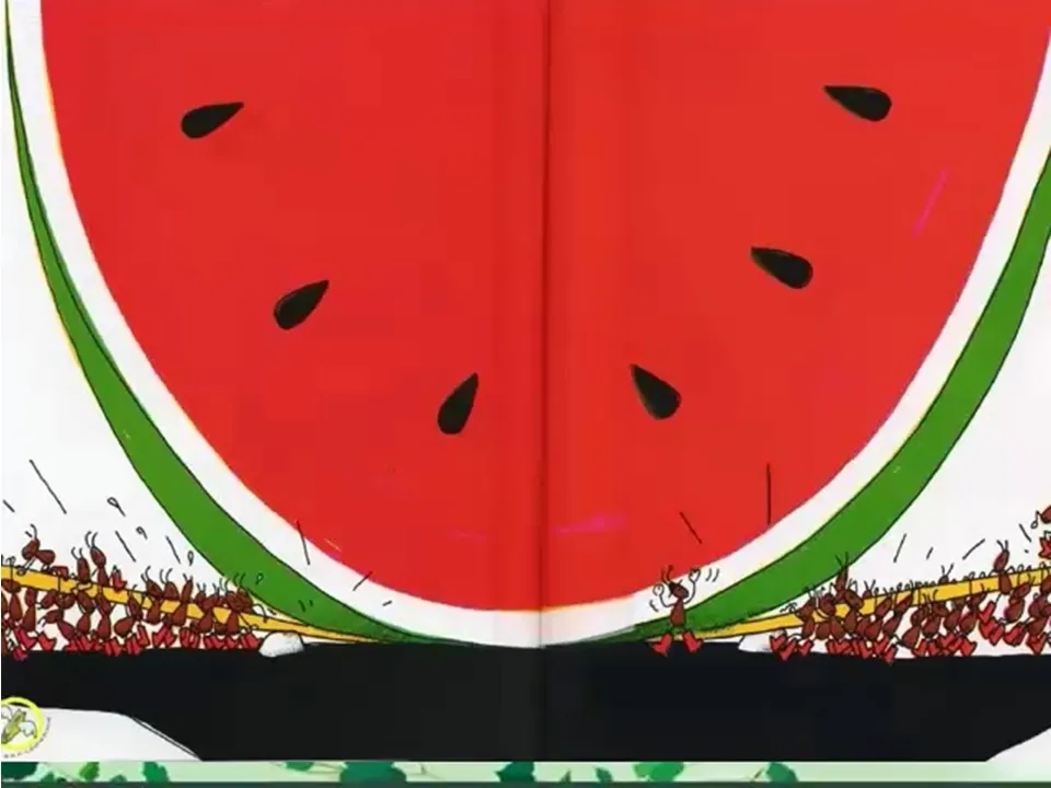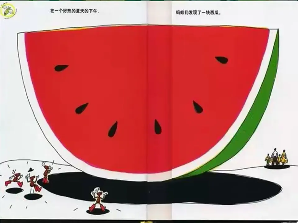 出示图片一:“图片上有什么?”“四只蚂蚁发现那么大的西瓜能抬回去吗?”