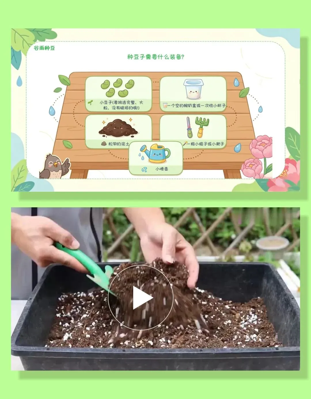能跟随步骤完成种豆操作,培养动手能力和观察耐心,愿意参与节气相关的实践活动。