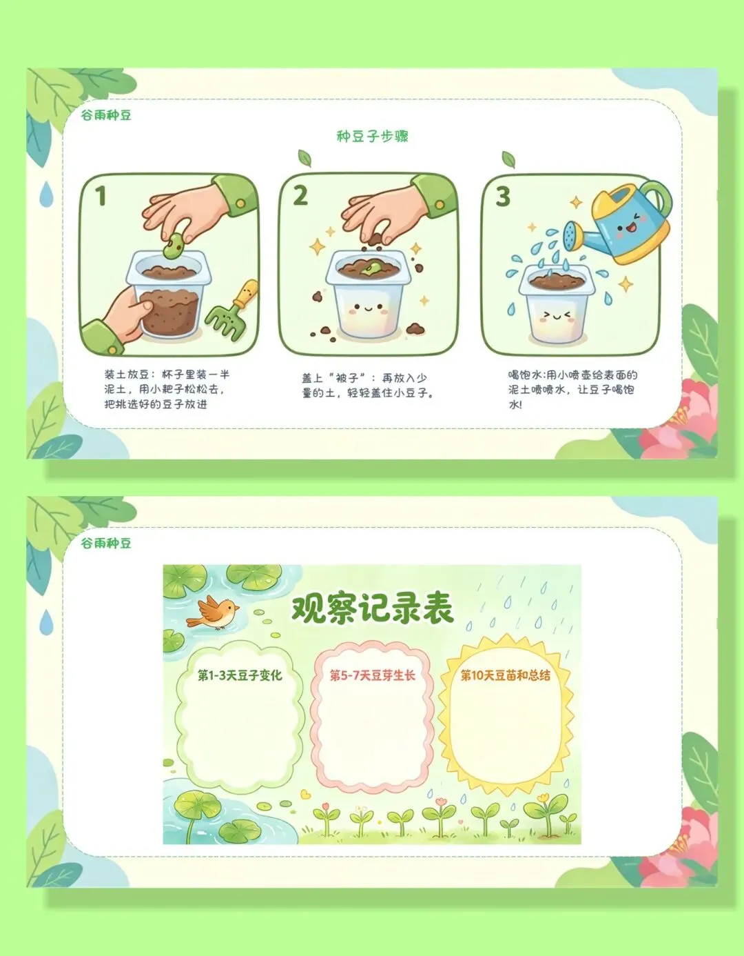 感受谷雨节气的自然趣味和传统文化魅力,激发对二十四节气和自然探索的兴趣,愿意和同伴分享自己的种豆过程与发现。