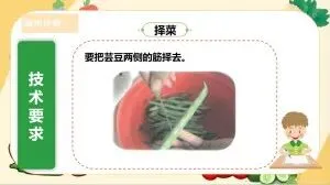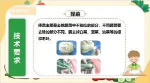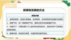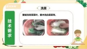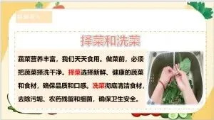 劳动技能:掌握挑选新鲜蔬菜的技巧,包括观察外观、气味等指标;熟练掌握洗菜的方法,能够彻底清洗食材并去除污垢和农药残留。