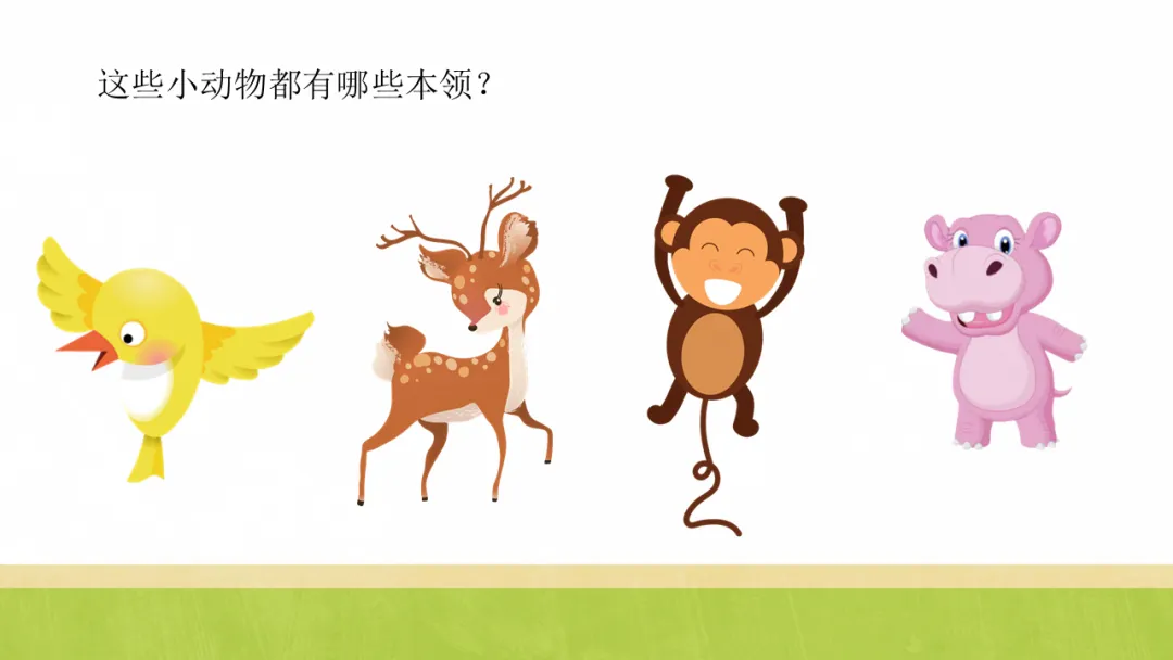 5、老师小结:小动物有自己的长处,每个小朋友也有自己的长处,我们要相互学习,做个聪明能干的小朋友。