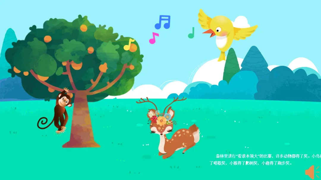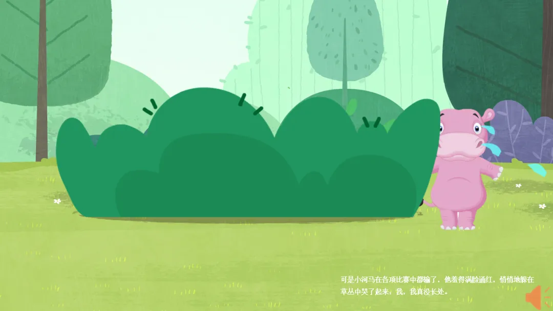 森林里进行“看谁本领大”的比赛,许多动物都得了奖。小鸟得了唱歌奖,小猴得了爬树奖,小鹿得了跑步奖。可是小河马在各项比赛中都输了,他羞得满脸通红,悄悄地躲在草丛中哭了起来:我,我真没长处。