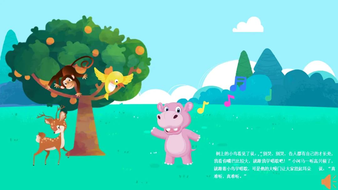 树上的小鸟看见了说:“别哭,别哭,各人都有自己的才长处,我看你嘴巴比较大,就跟我学唱歌吧!”小河马一听高兴极了,就跟着小鸟学唱歌,可是他的大嗓门让大家捂起耳朵说:“真难听,真难听。”小河马难过得流出了眼泪。